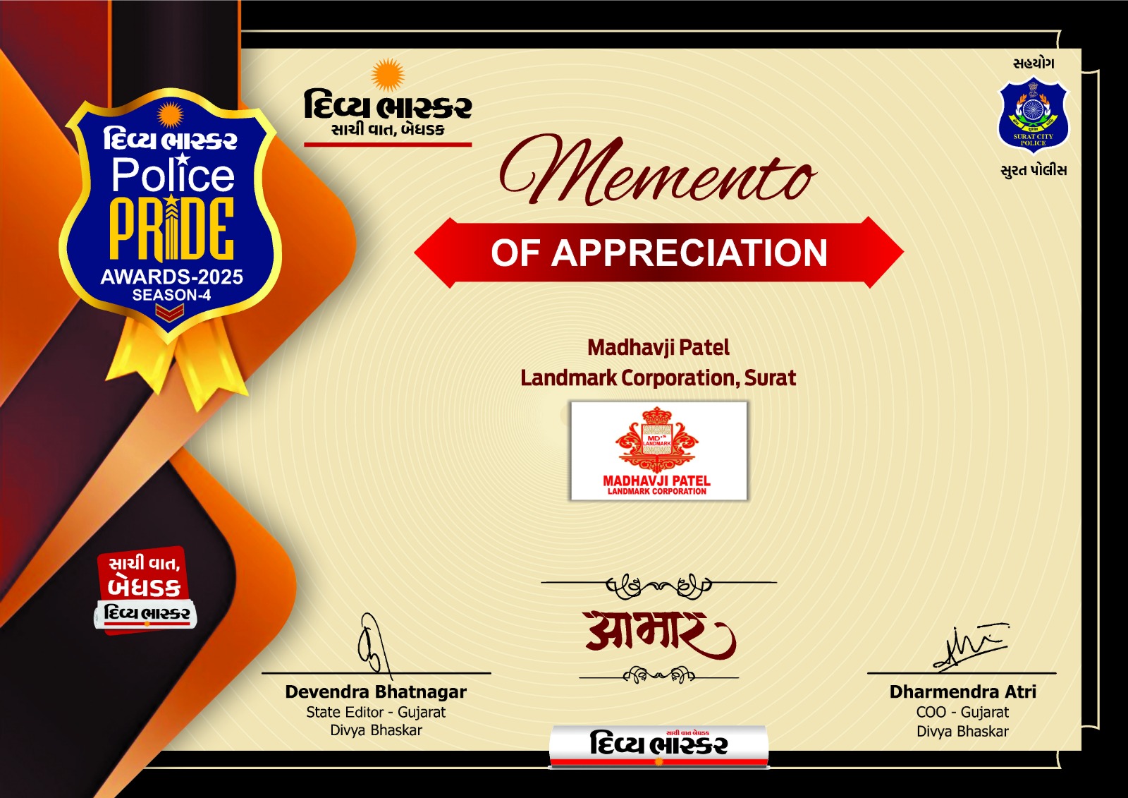 Jewels In the Crown & Saurashtra by divyabhaskar RK Excellence National Award 2013 1. RK Excellence National Award 2013 By R.K.HIV/AIDS & Research And Care2. Pride Of India Award to Madhavji Patel3. Best Builder & Developer Of The Year Award to Landmark Corporation UJAS